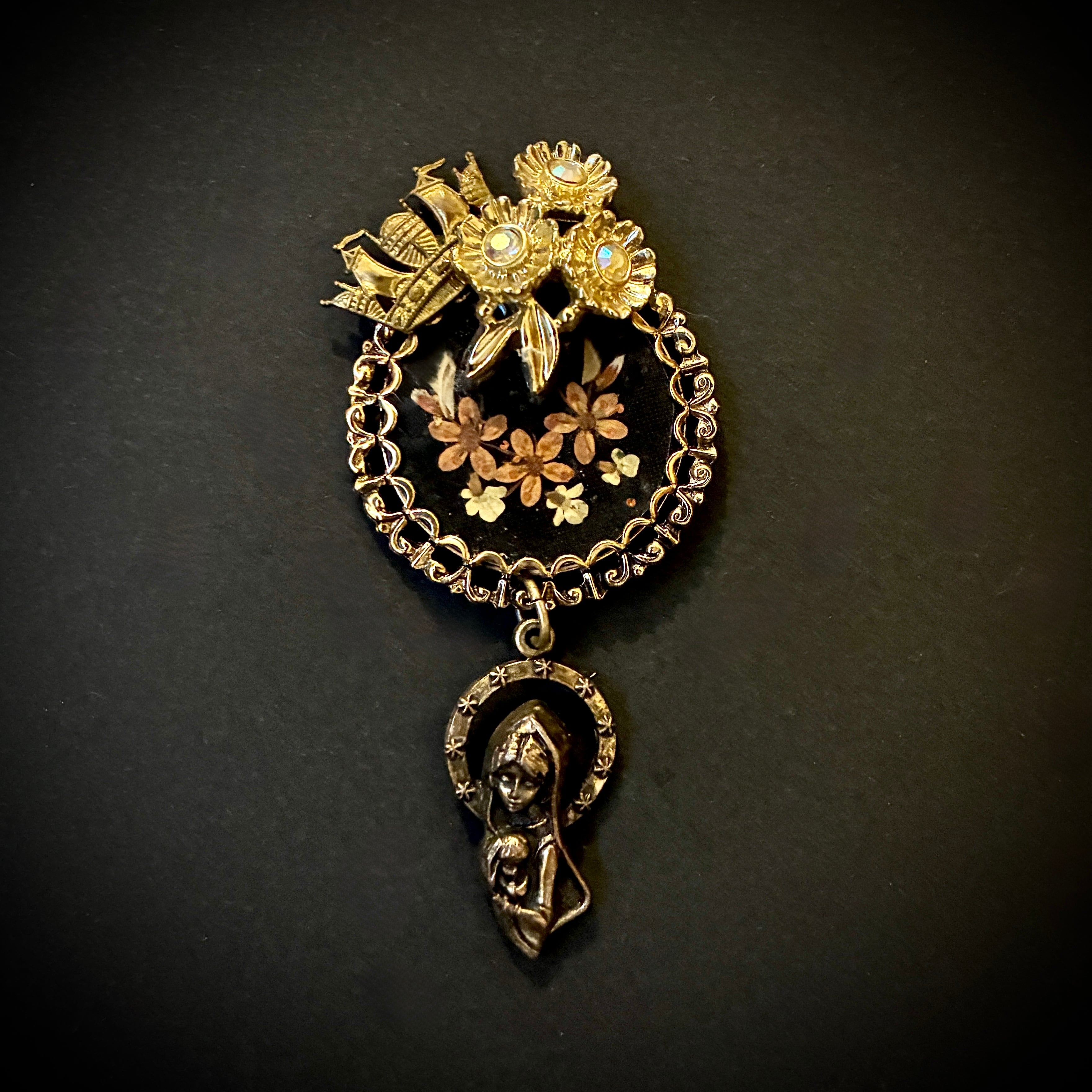 ドライフラワー入りの黒いパーツが品を添えるブローチです。